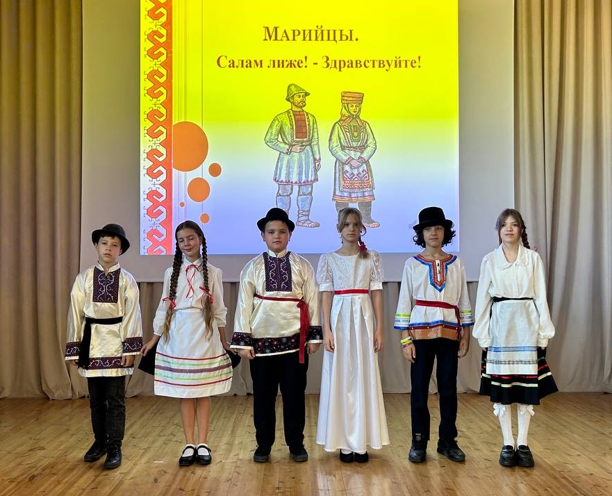 А в начальной школе сегодня представляли марийцев, финно-угорский народ, проживает, в основном, в Республике Марий Эл и на севере Республики Башкортостан. Красочные костюмы, увлекательная презентация и интересные вопросы не оставили зрителей равнодушными.
